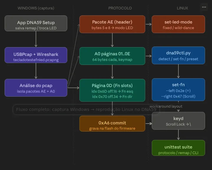 Na parte 1, descobri que as teclas Fn do DNA59 não existem do ponto de vista do sistema, elas são tratadas inteiramente dentro do firmware, sem gerar nenhum evento HID. Isso tornava qualquer tentativa de remap no Linux impossível sem conhecer o payload exato que o app oficial envia ao dispositivo.