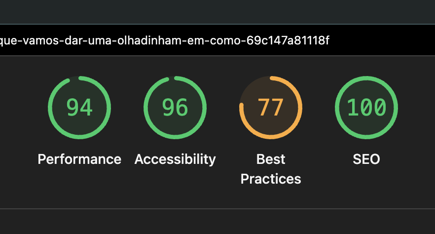 Seja honesto: fazer tudo sozinho dá trabalho. Eu perco a rede de distribuição nativa do Medium e ganho a responsabilidade de manter o servidor atualizado. Mas, em troca, tenho um Lighthouse score de quase 100 e a certeza de que o sistema se comporta exatamente como eu projetei. Isso é muito bom até por que eu nunca tinha mexi com SEO até ontem a noite quando programei esse blog.
